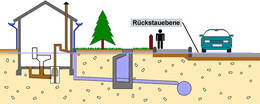 Nie Schmutzwasser oder Regenwasser (Regenwasserleitungen und Kellertreppenentwässerungen), das oberhalb der Rückstauebene anfällt, über die Rückstausicherung führen, sonst wird der Keller bei verschlossener Rückstausicherung unter Wasser gesetzt.